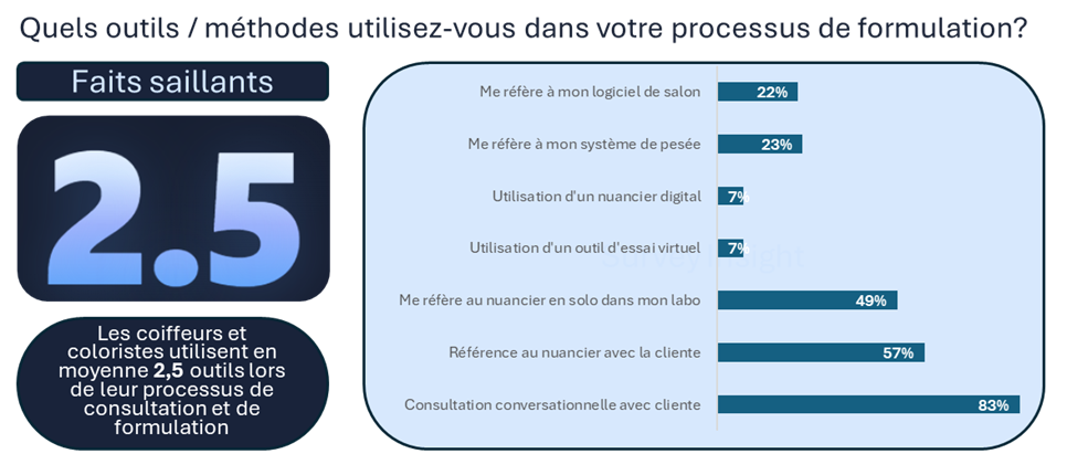 À la question : « Quels outils ou méthodes utilisez-vous dans votre processus de formulation ? », les coiffeurs et coloristes ont indiqué utiliser en moyenne 2,5 outils lors de leurs consultations et formulations.