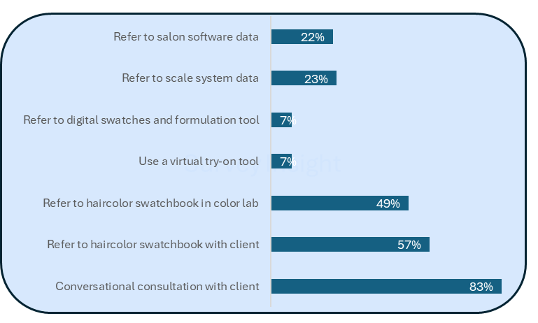 When asked, “Please select the tools or methods you use in your formulation process,” hairdressers and colorists reported using an average of 2.5 tools during their consultation and formulation process.